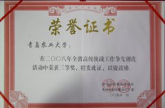 会上,青岛农业大学被评为“2008年度山东省高校统战工作争先创优活动三等奖”,同时有一项统战理论调研成果被评为“四新工程优秀理论调研成果”三等奖,受到山东省委统战部和省委高校工委联合表彰。