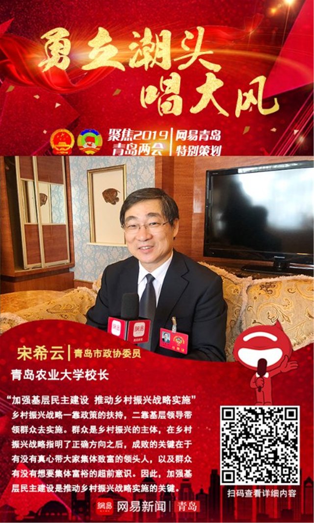 两会期间,青岛市政协委员、青岛农业大学校长宋希云接受网易新闻采访,结合提案畅谈乡村振兴战略实施。