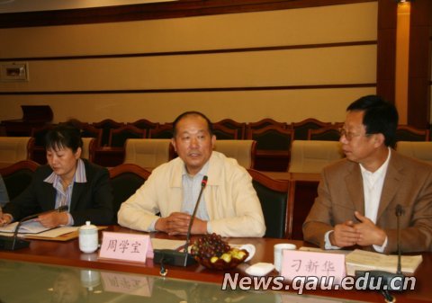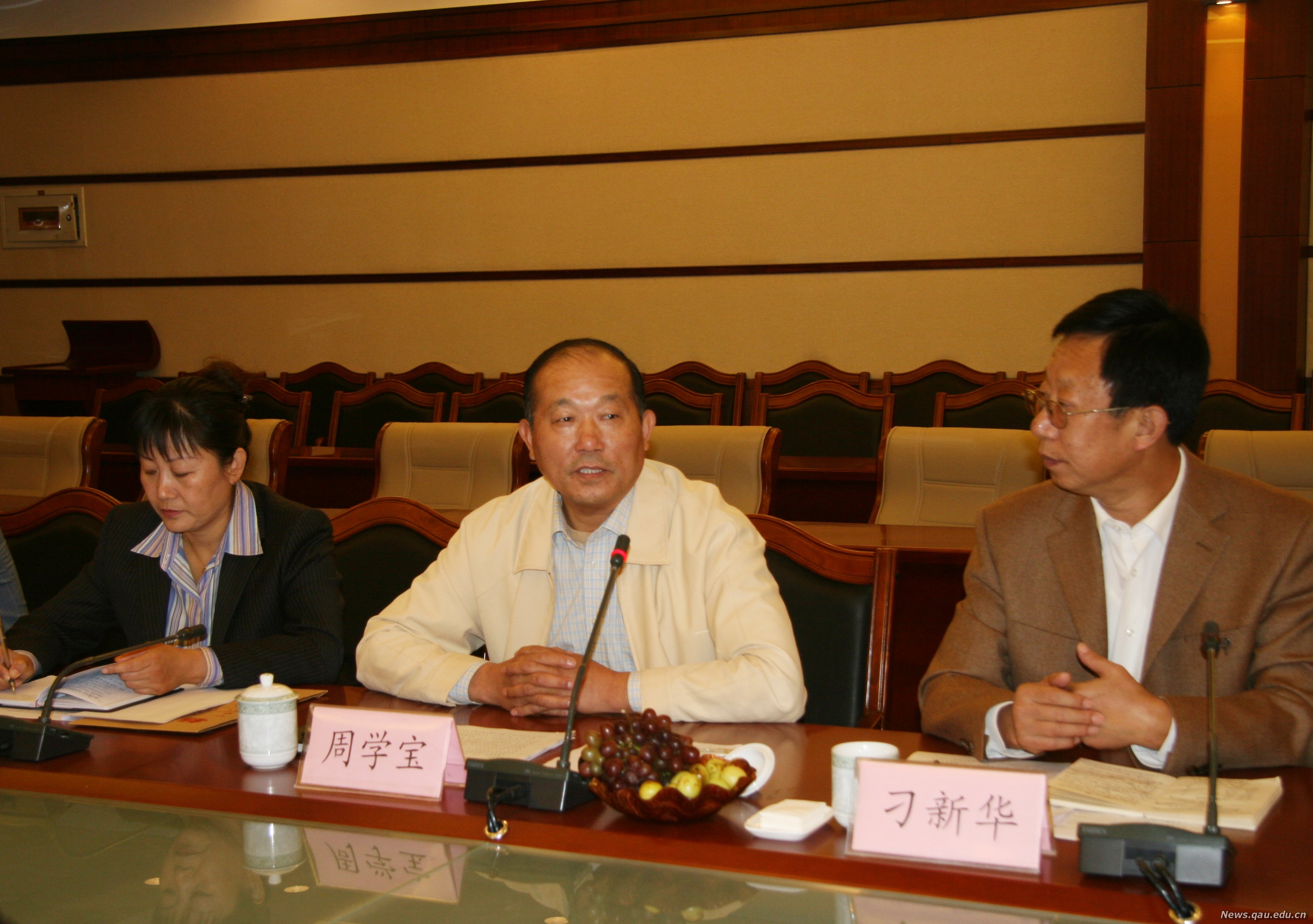 周学宝同志(中)在介绍学校发展及统战工作情况
