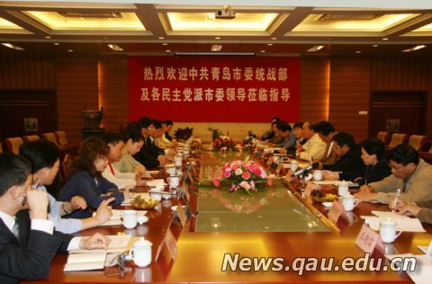 10月12日,中共青岛市委统战部常务副部长胡义瑛、市委统战部巡视员王可梅,城阳区政协副主席、统战部长于法鹏及青岛市各民族党派市委负责人一行来我校考察,就我校民主党派组织关系转入青岛后基层组织建设问题进行协商。协商会由党委副书记刁新华主持,校党委书记周学宝、青岛市委统战部常务副部长胡义瑛在会上讲话,校党委统战部部长张春华及我校各民主党派代表参加了会议。