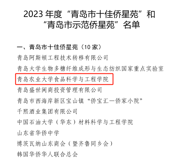 近日,青岛市归国华侨联合会公布了2023年度青岛市优秀侨星苑评选结果,我校食品科学与工程学院侨星苑获评“青岛市十佳侨星苑”,经济管理学院(合作社学院)侨星苑获评“青岛市积极参政议政示范侨星苑”。