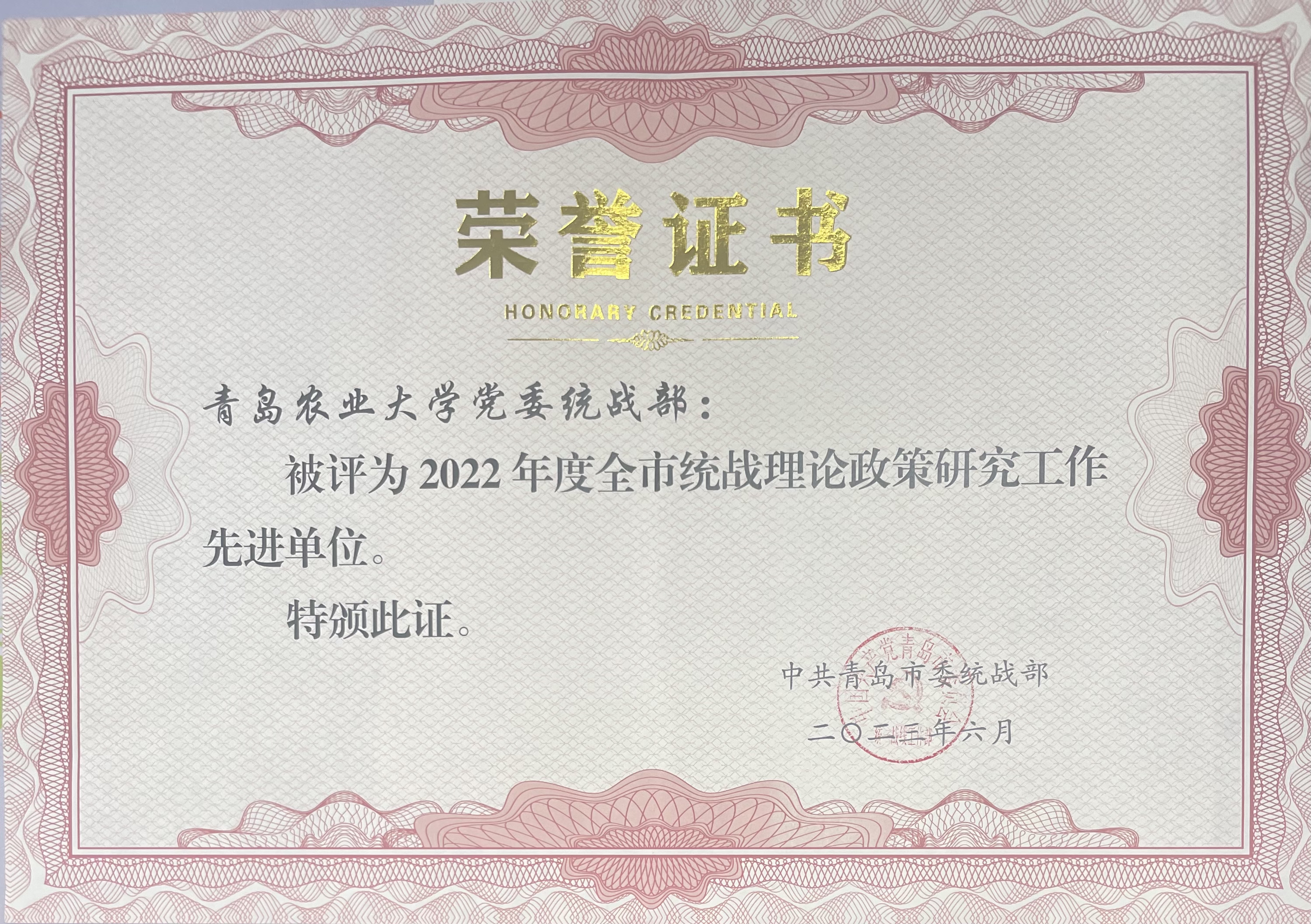 为总结经验、树立典型、推动工作,近日,中共青岛市委统战部对2022年度全市统战理论政策研究、宣传、实践创新、信息工作先进单位、先进个人和优秀成果进行了表扬通报,学校党委统战部获评“统战理论政策研究工作先进单位”和“统战信息工作先进单位”,2人获评“统战信息工作先进个人”,1人获评“建言献策突出贡献个人”,1项工作案例获“统战工作实践创新成果”,5项统战理论政策研究成果分获优秀成果一、二、三奖。