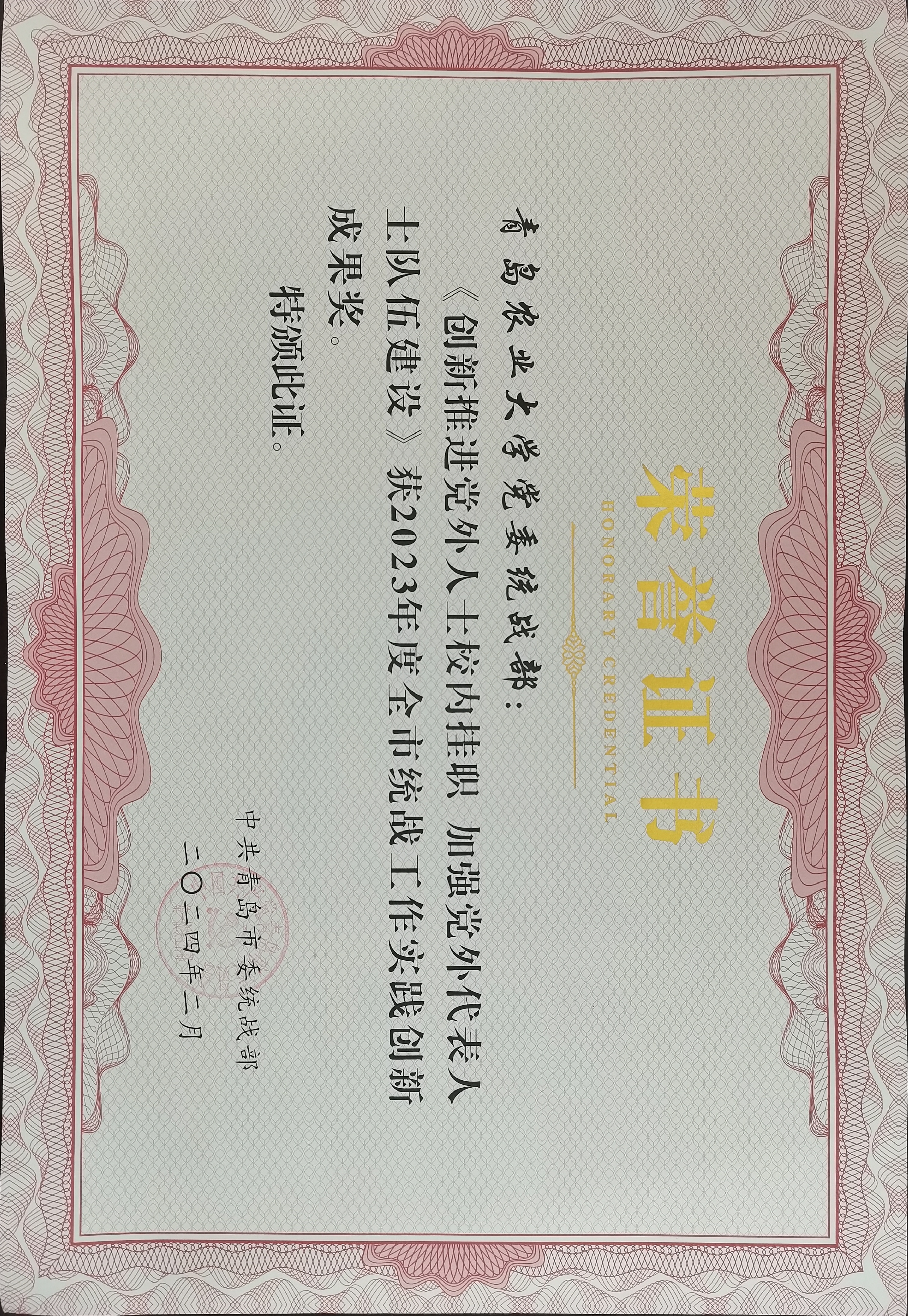 会议对2023年度全省、全市统战工作先进单位、先进个人和优秀成果进行了表扬通报,学校统战工作荣获多项表彰。青岛农业大学获评全省统战信息工作先进单位,学校党委统战部副部长孙贝贝获评全省统战信息工作优秀信息员。学校党委统战部提报的《创新推进党外人士校内挂职 加强党外代表人士队伍建设》获评青岛市统战工作实践创新成果。陈泽文《青岛市自由职业人员统战工作研究》获青岛市统战理论调研优秀成果一等奖;王亮《深化互联网宗教治理研究》,宋晓炜《基于中华优秀传统文化视野铸牢各族青少年中华民族共同体意识研究》,蔡娬、邹楠《新时代网络统战工作研究》获青岛市统战理论调研优秀成果三等奖。