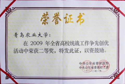 在1月29日召开的全省统战部长会议上,青岛农业大学获2009年度全省高校统战工作“争先创优”活动二等奖,党委统战部推荐的通讯《有教授做顾问我们就放心了》获2009年度全省统战理论调研宣传“四新工程”优秀成果二等奖。山东省委副书记、省政协主席刘伟,省政协副主席、省委统战部长张传林到会讲话并为获奖单位颁奖。