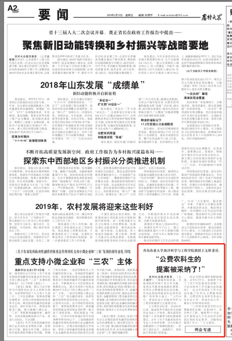 “报告提到了要着力发展教育事业,很欣慰的是,我去年提交的两个提案均得到了政府部门的重视。”王文琪告诉记者,她一直积极为我省教育事业和基层农技推广体系建设等方面的发展建言献策。去年,她提交的“关于实施高校涉农专业人才培养免费,为乡村振兴战略提供人才保障”和“加强和完善山东省农技推广体系建设”的提案,得到了省农业农村厅、省海洋局、省教育厅、省财政厅等多部门的答复和落实。2018年6月7日,省政府下发了《关于印发<山东省基层农技推广人才定向培养实施办法>的通知》,并于同年8月启动实施农科公费教育政策和详细的招生工作,由青岛农业大学等3所高校承担。