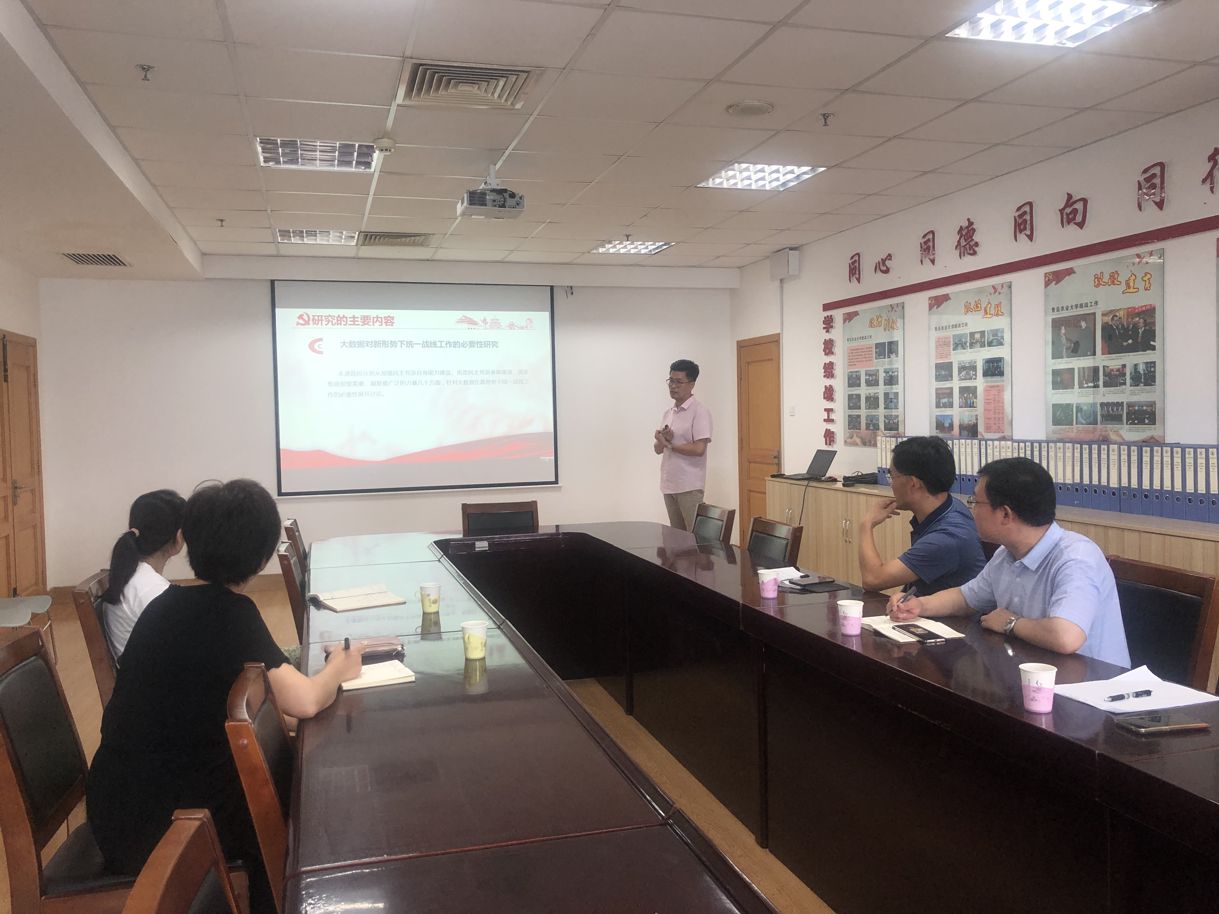 会谈之后,王先华一行专门听取了理信学院赵磊老师关于《大数据在统战工作中的应用研究》课题的汇报,并就共同合作做好项目进行了深入交流。理信学院党委书记杨凯、统战部副部长徐以师陪同听取了汇报,并就项目深入合作表示,将充分发挥学院和学校的资源优势,推进项目研究和落地。