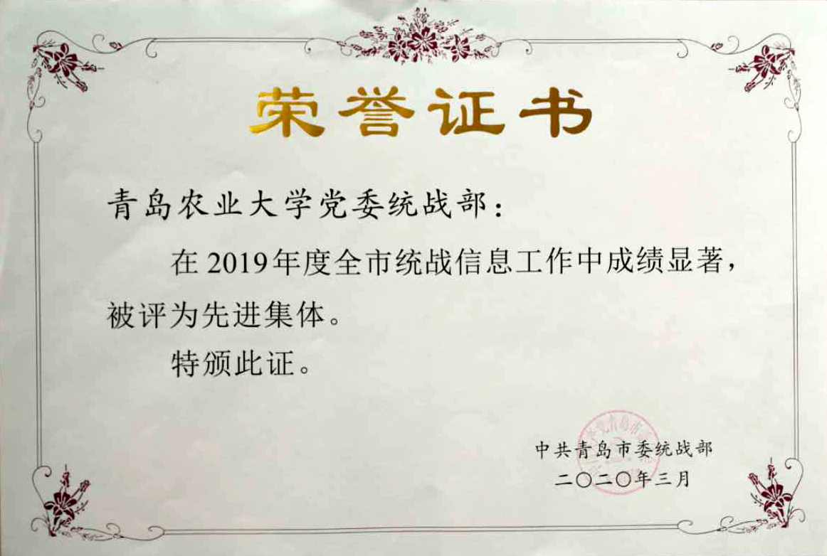 我校荣获全市统战信息工作先进单位,学校党委统战部提报的统战理论调研成果《高校抵御宗教渗透和防范校园传教的有效路径和长效机制探析》获2019年度山东省统战理论政策研究优秀成果三等奖,刘启营、杜鹍撰写的《完善新的社会阶层人士统战工作社会化机制研究》获2019年度青岛市统战理论调研优秀成果三等奖,孙贝贝获评全市统战信息工作先进个人,受到大会通报表彰。