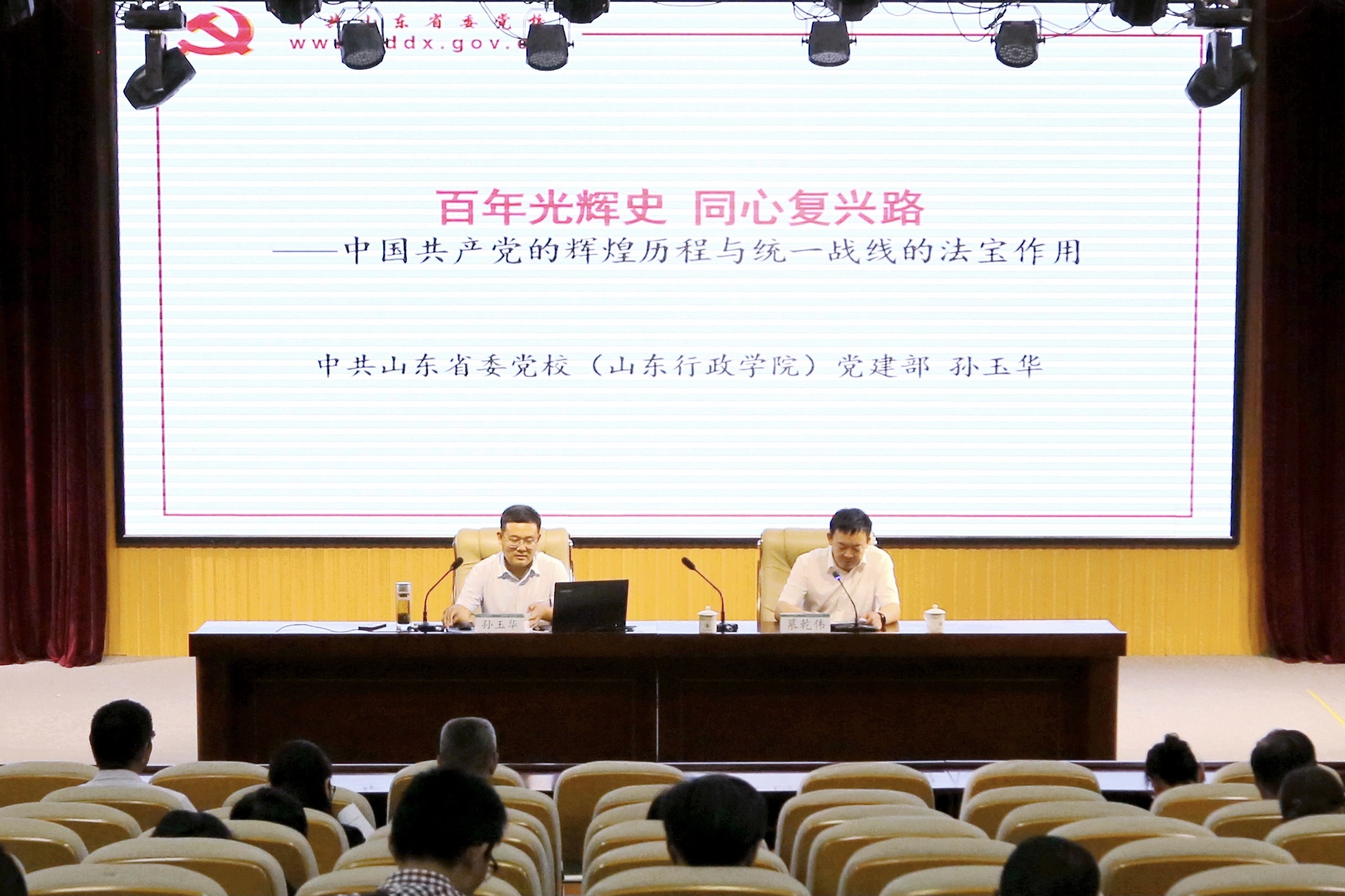 开班仪式后,山东省委党校孙玉华教授为读书班学员作了《百年光辉史,同心复兴路——中国共产党的辉煌历程与统一战线的法宝作用》专题辅导报告,以中国共产党领导下的统一战线发展历史为脉络,讲授了党的统一战线事业发展的伟大历程和辉煌成就,并结合《中国共产党统一战线工作条例》,进一步讲明了新时期统一战线的重要法宝地位。