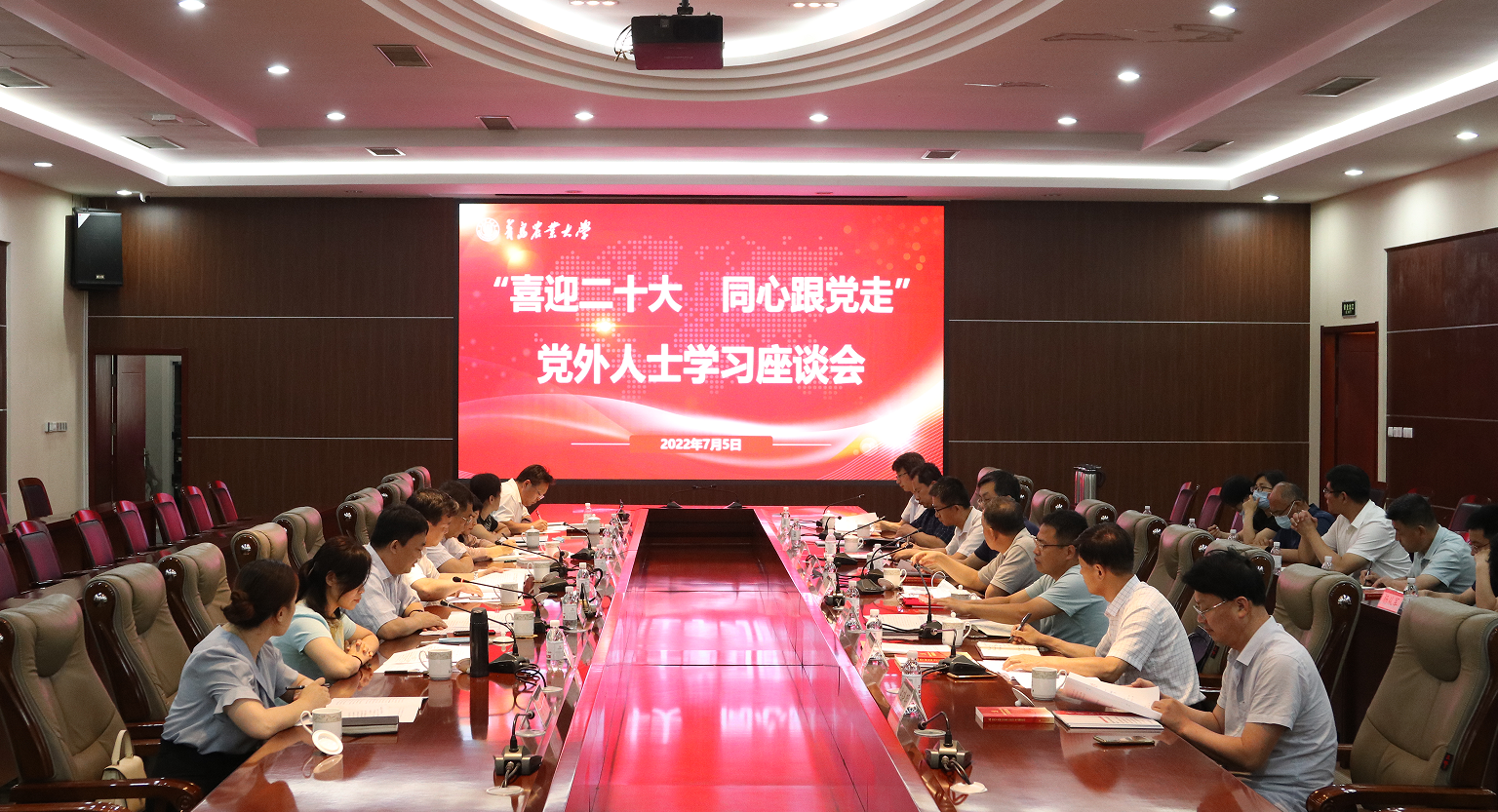 7月5日下午,青岛农业大学“喜迎二十大 同心跟党走”党外人士学习座谈会在学术会馆会议厅召开。校党委书记郭善利出席会议并讲话,校党委副书记王庆军主持会议,校党委委员、宣传部部长、统战部部长慕乾伟进行学习宣讲并部署“喜迎二十大 同心跟党走”主题教育工作。